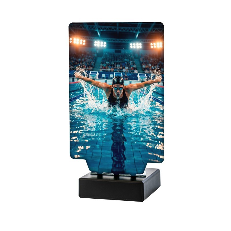 TROFEO AURA NATACION FEMENINA REALIZADO EN ACERO Y BASE DE MARMOL NEGRO. DISPONIBLE EN 3 MEDIDAS.