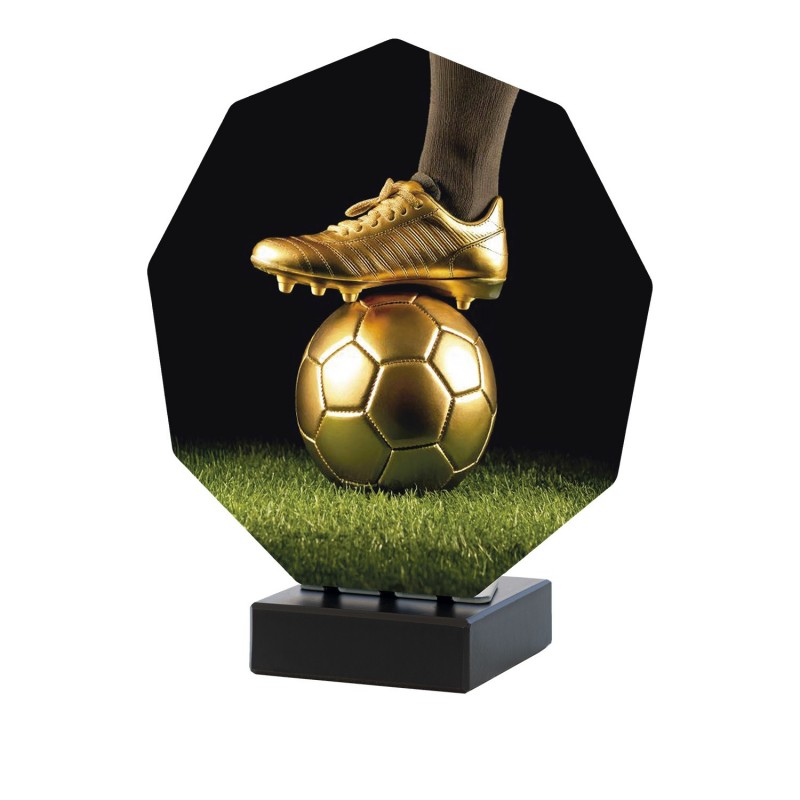 TROFEO LUXOR DE FUTBOL CON LA FIGURA UN BALON Y UNA BOTA DE FUTBOL. REALIZADO EN ACERO Y BASE DE MARMOL NEGRO. DISPONIBLE EN 3 MEDIDAS 16.5/17.5/18.5 CM.
